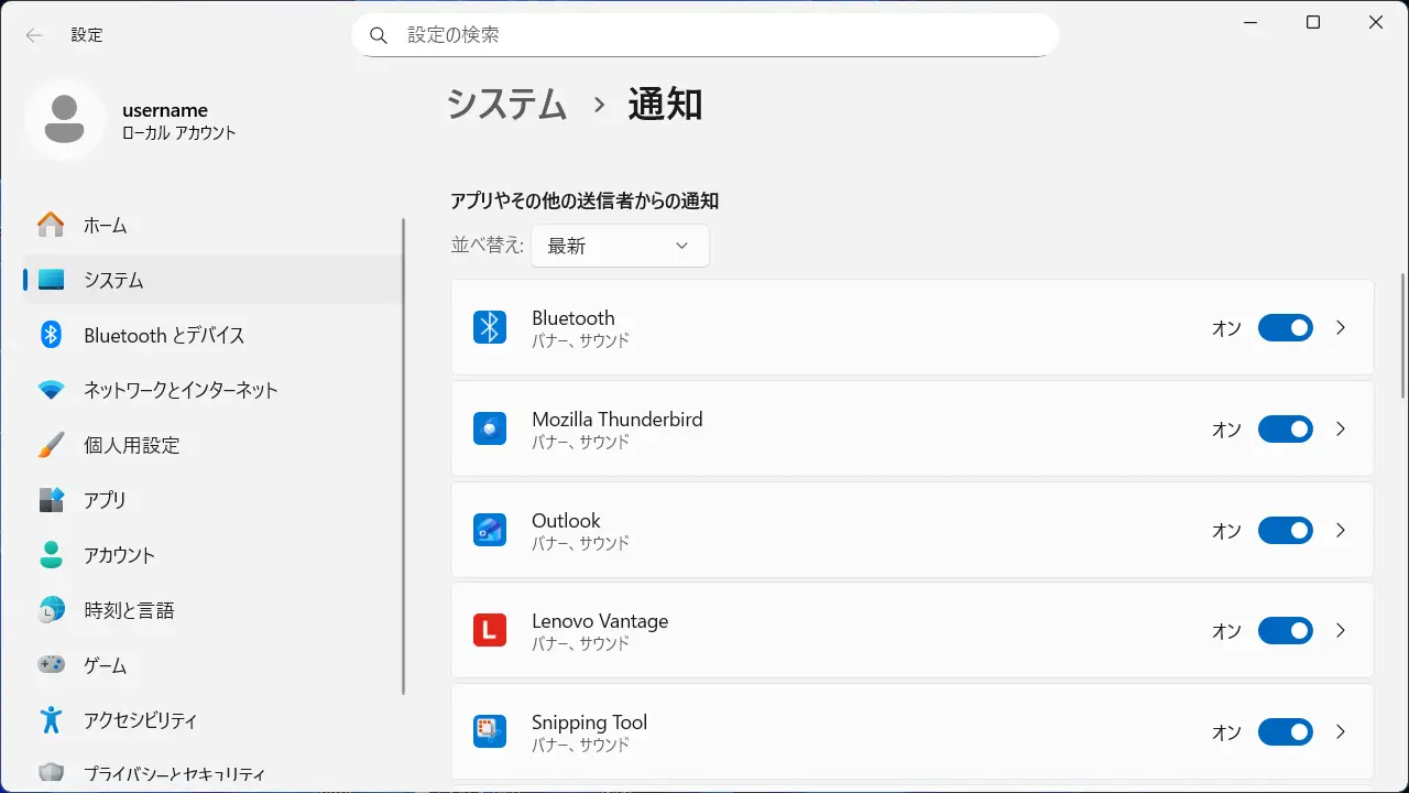 Windows 11→設定→システム→通知→アプリやその他の送信者からの通知