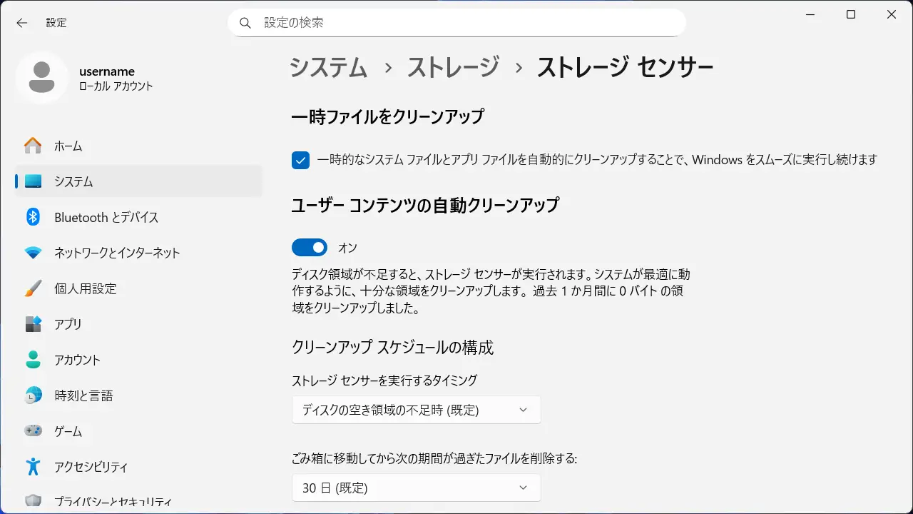 パソコンは使っていくうちに一時ファイルなどの不要なファイルが溜まっていくので定期的に削除するのが望ましいですが、Windows 11にはストレージセンサーと呼ばれる機能があり、これをオンにすると一定期間後に自動で削除してくれます。