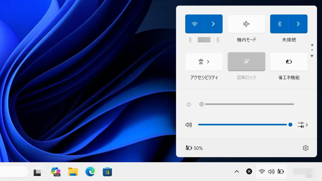 以前はアクションセンターと呼ばれ、表示するクイックアクションを追加/削除などカスタマイズが可能でしたが、廃止され代わりにクイック設定が搭載されています。