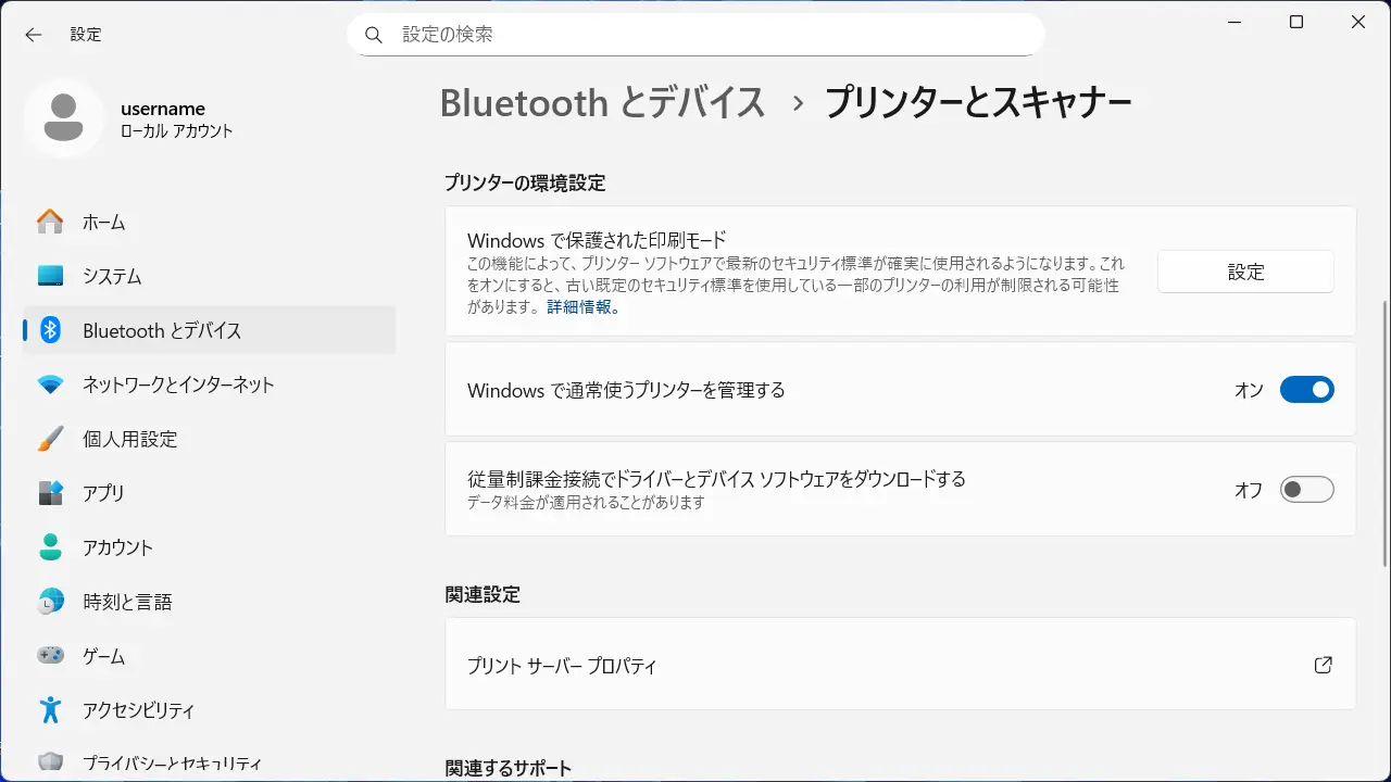 プリンターとスキャナーよりWindowsで通常使うプリンターを管理するをオンに切り替えます(画像はオンの状態)。