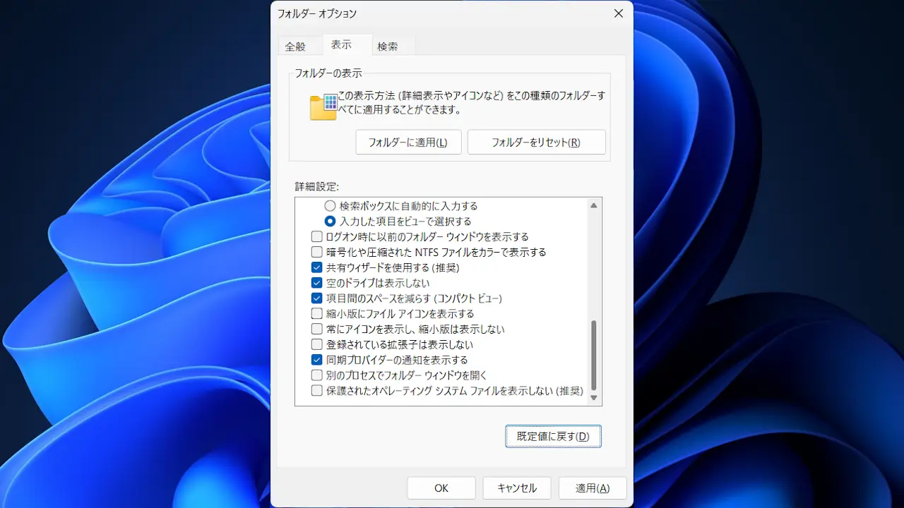 Windows 11→エクスプローラー→フォルダーオプション→表示