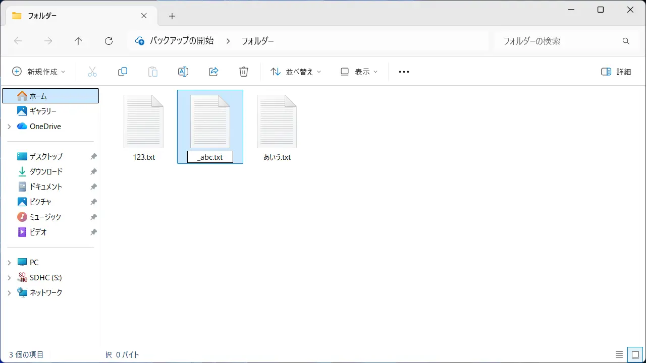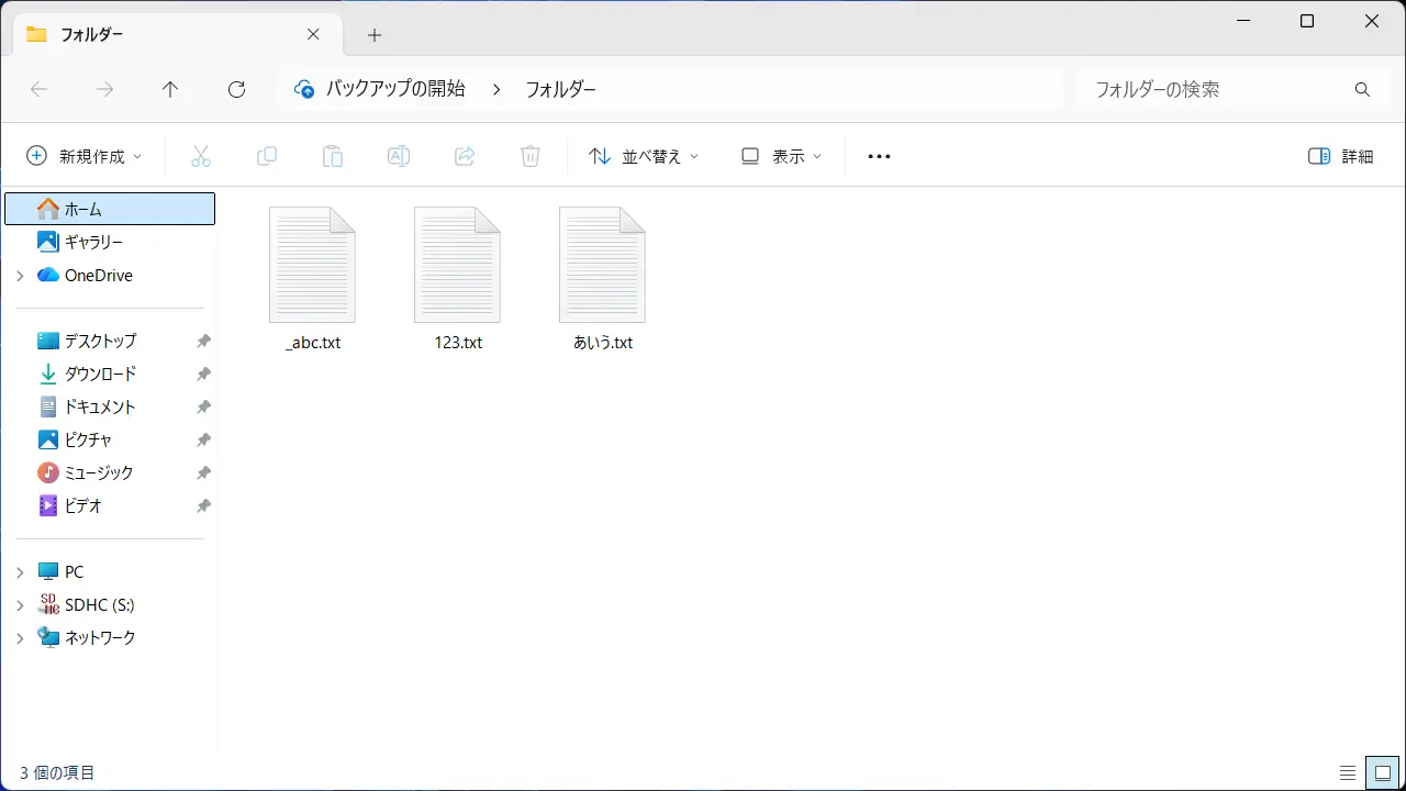 日本語の環境ではひらがなカタカナ漢字の他に英字数字記号なども使われ、Windows 11のエクスプローラーで確認したところ順番は以下のようになります(ちなみに、半角/全角は半角の方が先)。