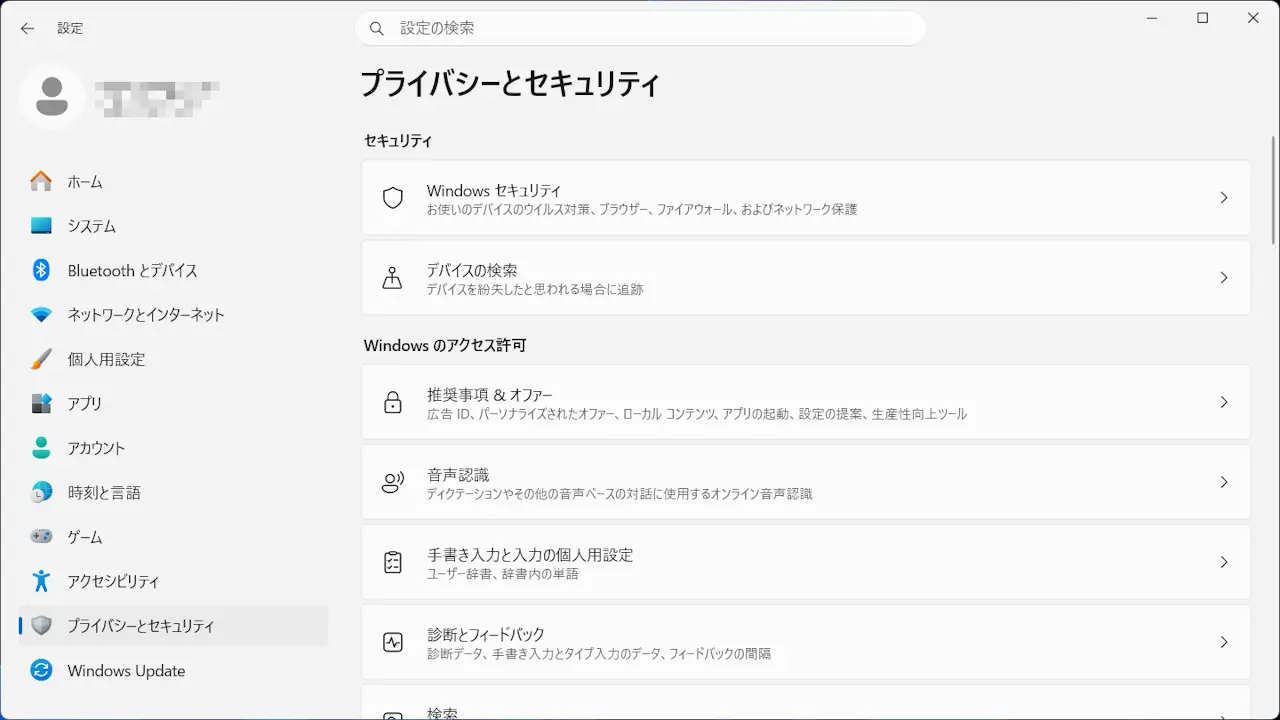 設定のプライバシーとセキュリティよりデバイスの検索をクリックします。