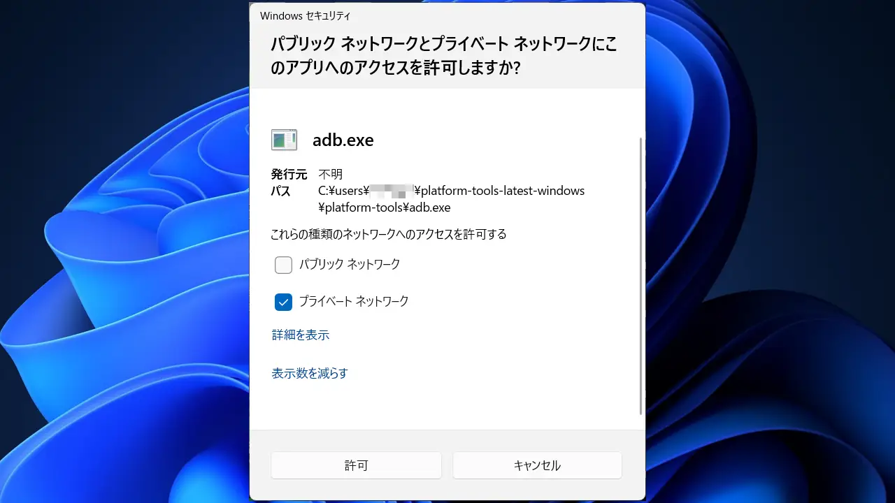 パブリックネットワークとプライベートネットワークにこのアプリへのアクセスを許可しますか?より表示数を増やすをクリックします。