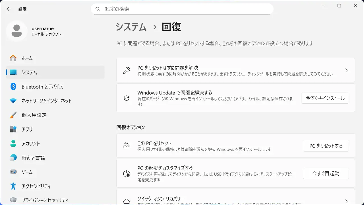 Windows 11のパソコンを初期化するには、設定のシステム>回復よりこのPCをリセットを実行するのが一般的です。
