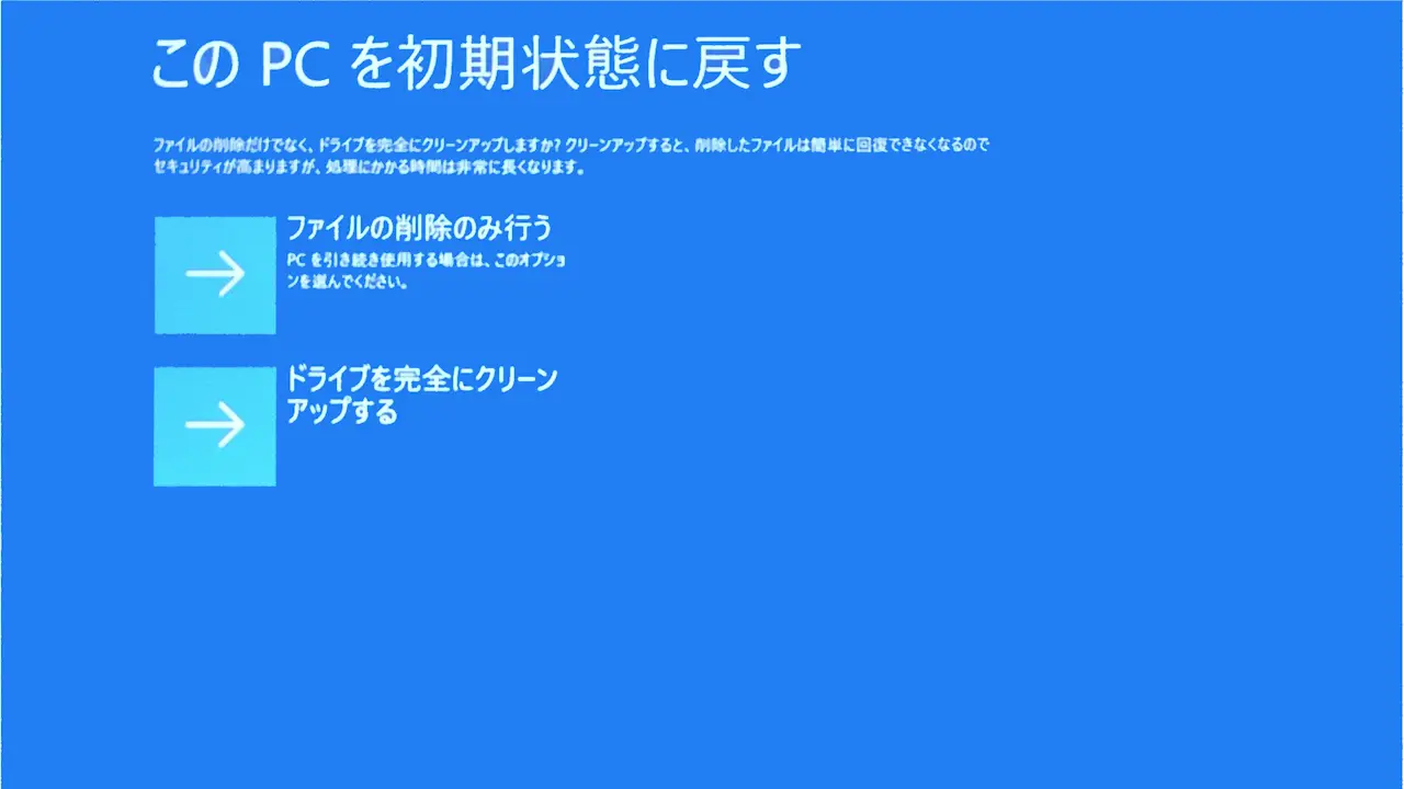 Windows 11の設定より[このPCをリセット]をして初期化すると「異常なほど時間がかかる」「途中で止まり進まない」と言った失敗が多いので、Windows REの【このPCを初期状態に戻す】をしたところ初期化できました。