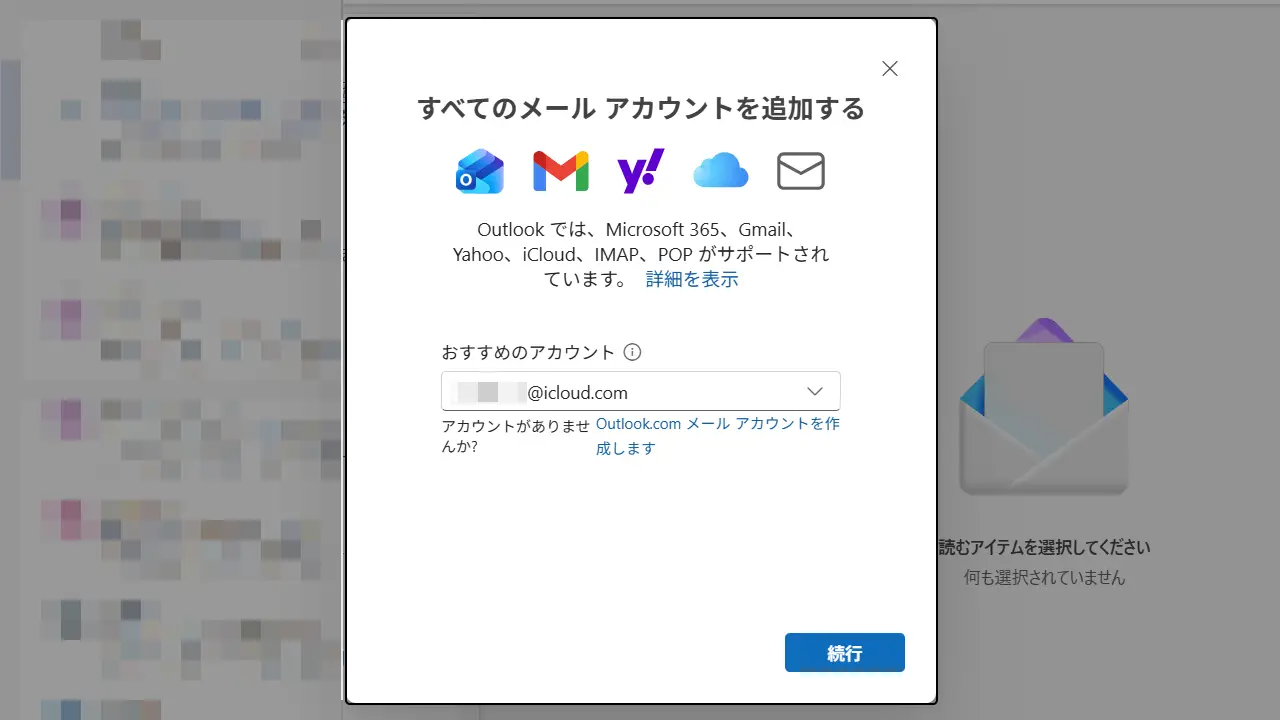 “すべてのメールアカウントを追加する”よりiCloudメールのメールアドレスを入力し続行をクリックします。