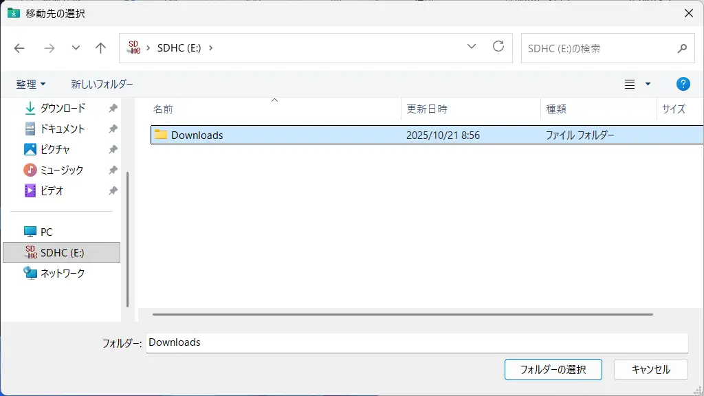 新規作成した移動先のフォルダーを選択しフォルダーの選択をクリックします。