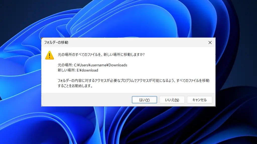 フォルダーの移動より元の場所と新しい場所を確認しはい/いいえ/キャンセルをクリックします。