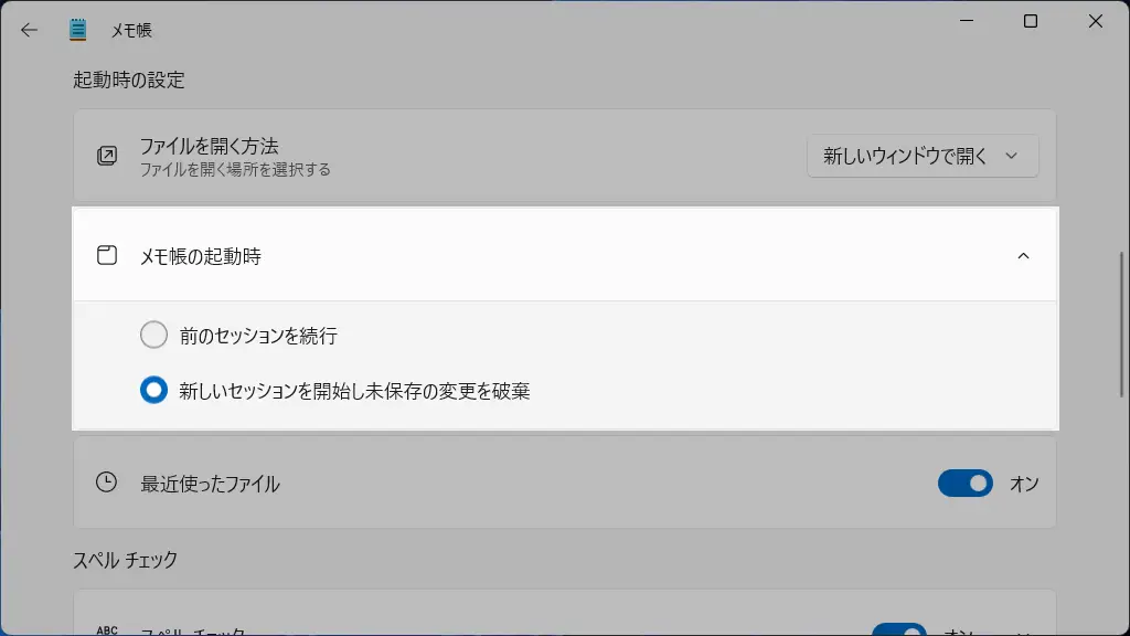 Windows 11→メモ帳→設定→メモ帳の起動時→新しいセッションを開始し未保存の変更を破棄