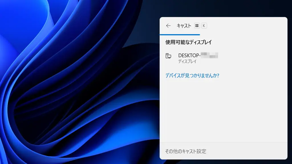キーボードよりKキーを押下し、キャストの利用可能なディスプレイより対象のPC名をクリックすると接続されます。