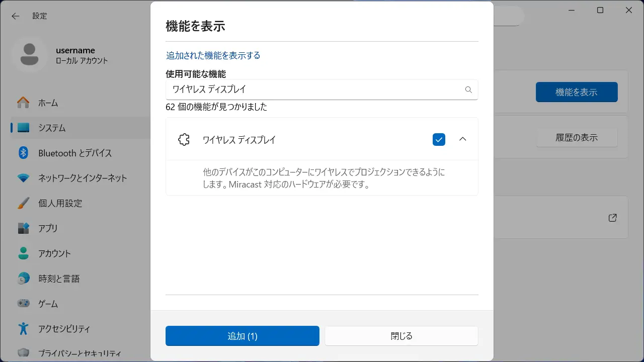 初回のみオプション機能のワイヤレス ディスプレイをインストールする必要があります。
