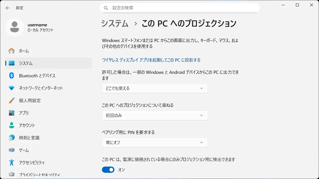 “このPCへのプロジェクション”より各項目を任意に変更しワイヤレスディスプレイアプリを起動してこのPCに投影するをクリックします。