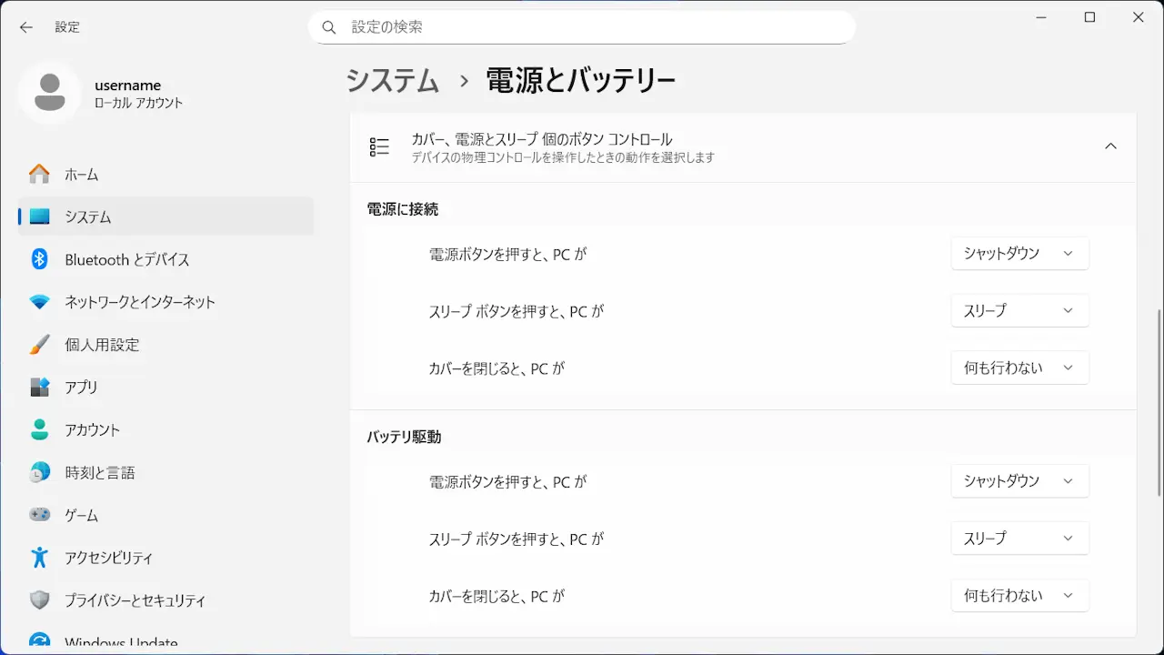 ただ、Windows 11では電源ボタンでシャットダウンすると言うこともできるようになっており、これにより他の電化製品と同様に電源ボタンで電源のオン/オフを操作できるようになります。また、ほかにも電源ボタンでスリープすることもできるので、使い勝手の良い項目を選択すればよいでしょう。