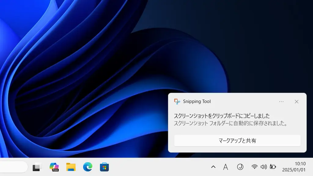 “全画面表示”を除き切り取り領域を選択するとスクリーンショットが撮影されクリップボードおよび画像で保存されます。