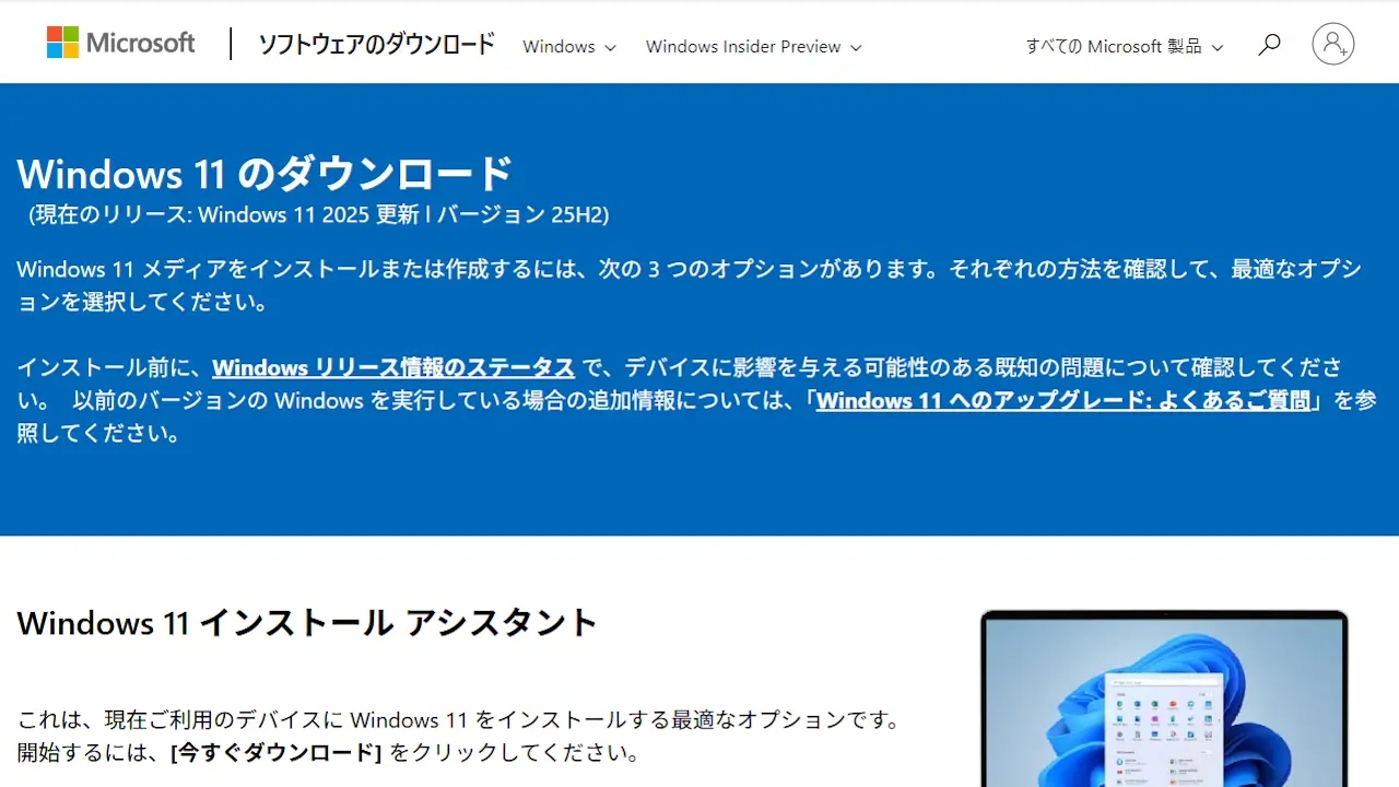 Webブラウザより“Windows 11 のダウンロード”にアクセスします。
