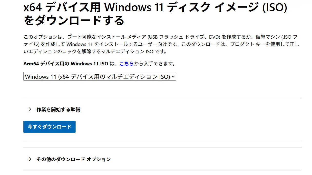 x64 デバイス用 Windows 11 ディスク イメージ (ISO) をダウンロードする>ダウンロードを選択よりWindows 11(x64 デバイス用のマルチエディション ISO)を選択し今すぐダウンロードをクリックします。