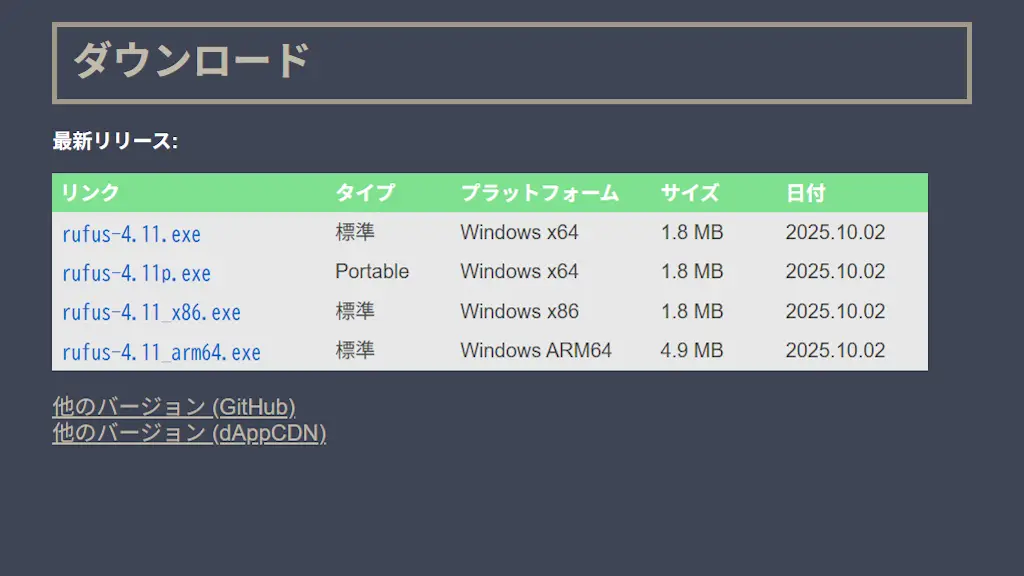 Webブラウザより“Rufus”にアクセスしダウンロードよりrufus-4.11.exeをダウンロードします。