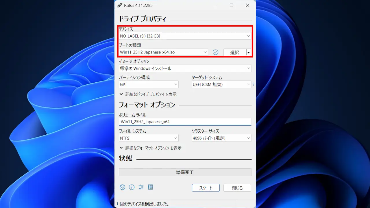 ダウンロードした“rufus-4.11.exe”を実行しデバイスUSBメモリーを選択、ブートの種類>選択よりISOファイルを選択しスタートをクリックします。