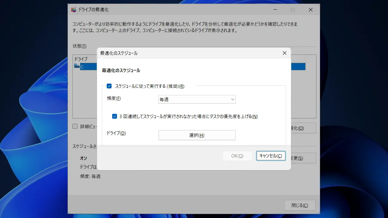 Windows 11→ドライブの最適化→最適化のスケジュール