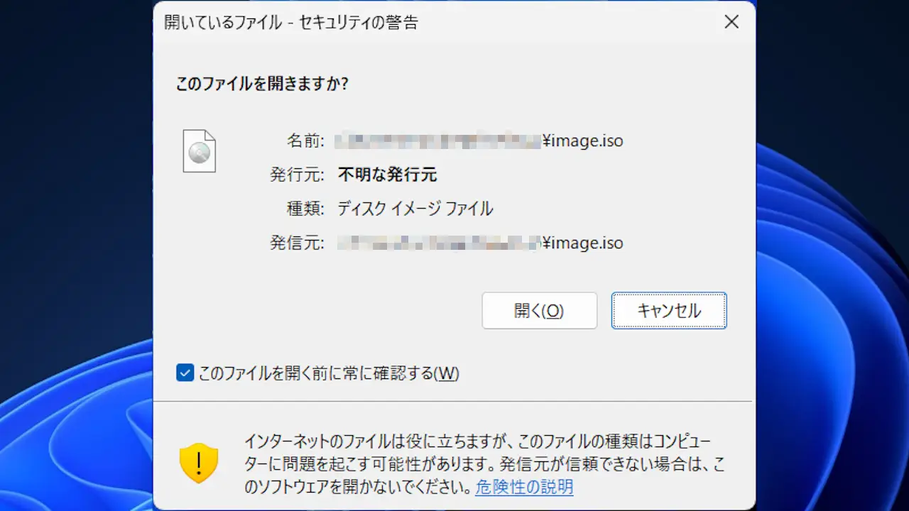 開くをクリックすると自動再生されるので、出所が不明なファイルはキャンセル(マウントされない)をクリックした方が良いです。