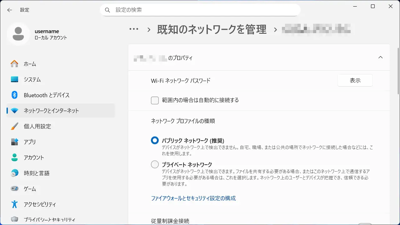 既知のネットワークを管理より対象のWi-Fiアクセスポイントをクリックします。