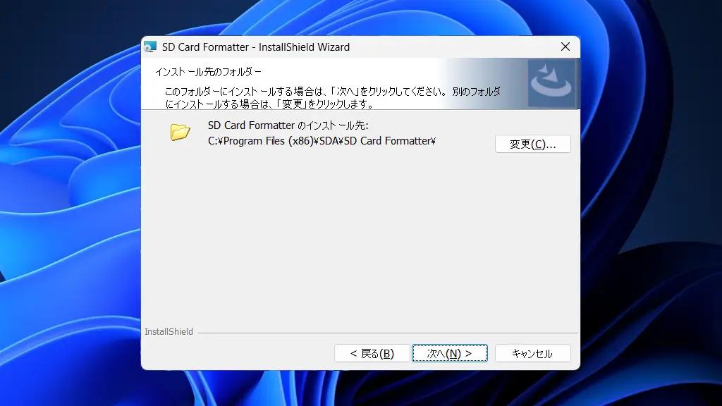 ダウンロードしたファイルを展開し、SD Card Formatter 5.0.3 Setup JP(.exe)を実行したら次へをクリックします。