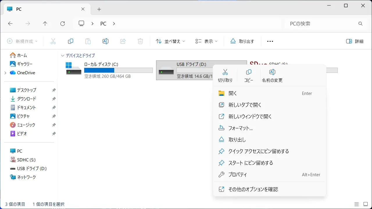 エクスプローラーのPC>対象のストレージを右クリックし、コンテキストメニューよりフォーマットをクリックします。