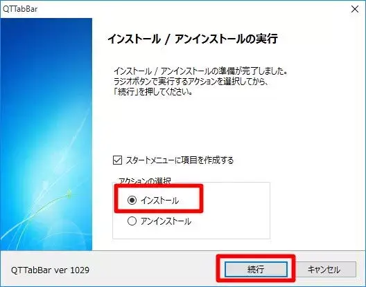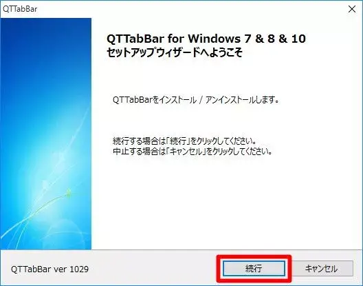 WebブラウザよりQTTabBarにアクセスしてダウンロードしたファイルを展開し、インストーラーを実行したら続行をクリックします。
