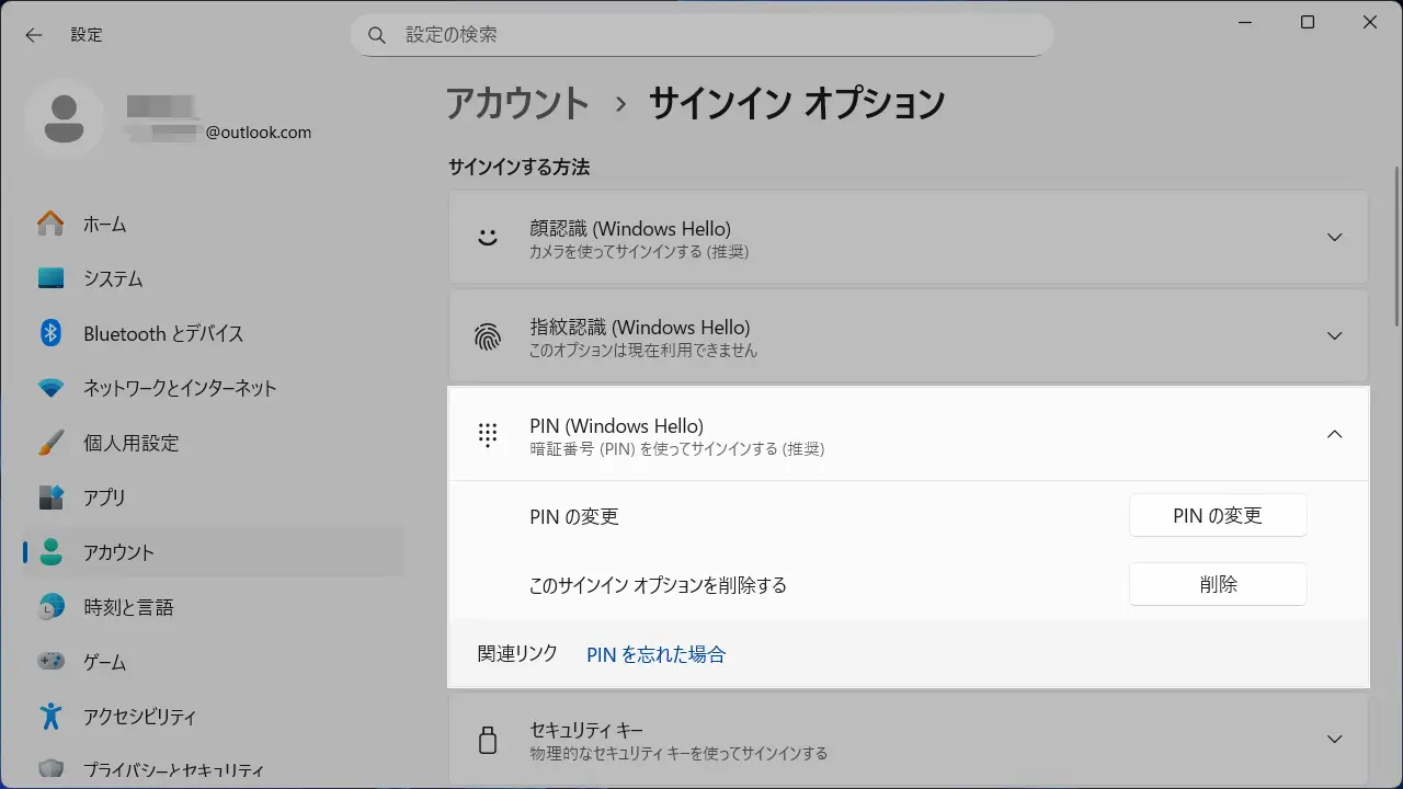 Windows 11→設定→アカウント→サインインオプション→PIN(Windows Hello)→Windowsセキュリティ
