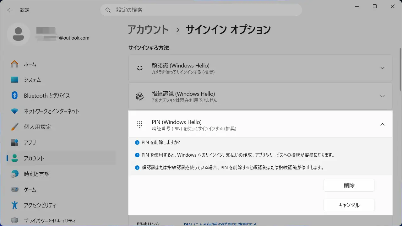 サインインオプションのPIN(Windows Hello)>vより削除をクリックします。